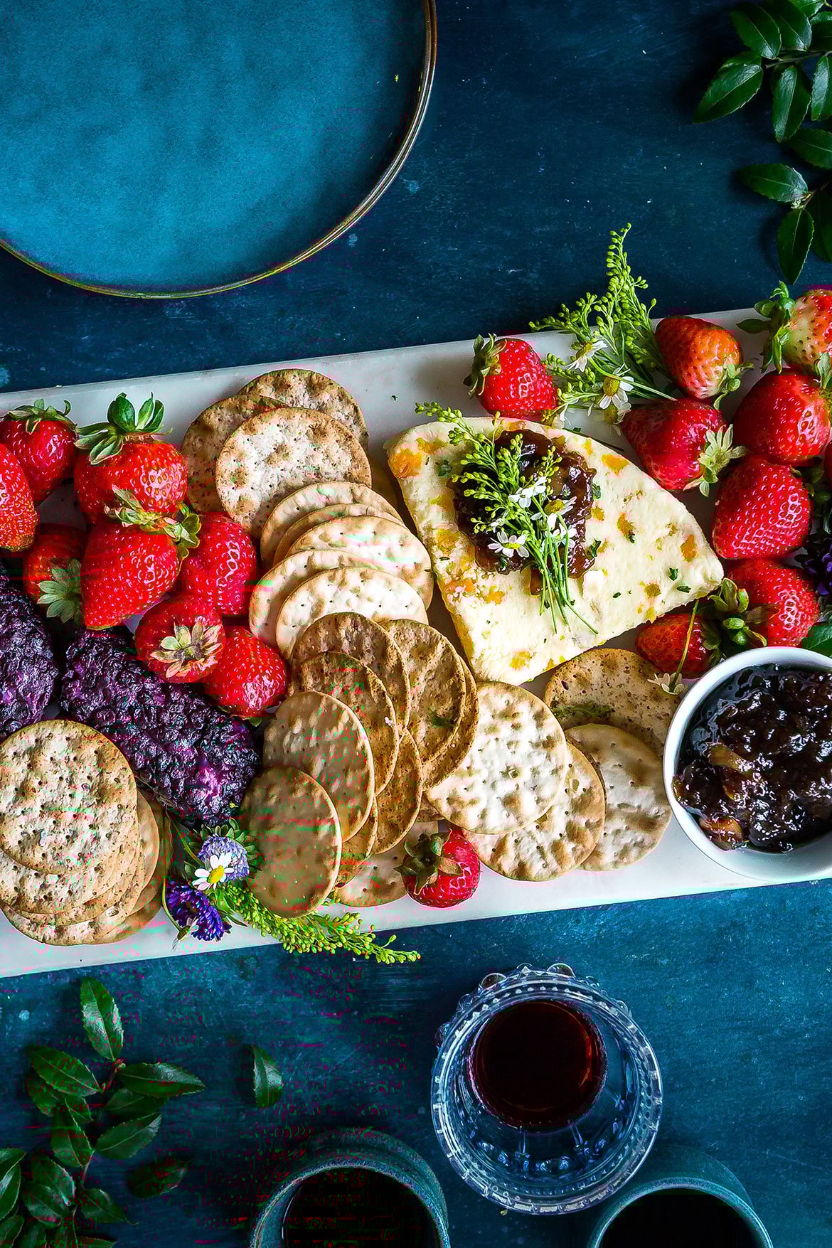 1. On large serving platter, arrange cheeses in center. Cover; let stand at room temperature about 30 minutes.